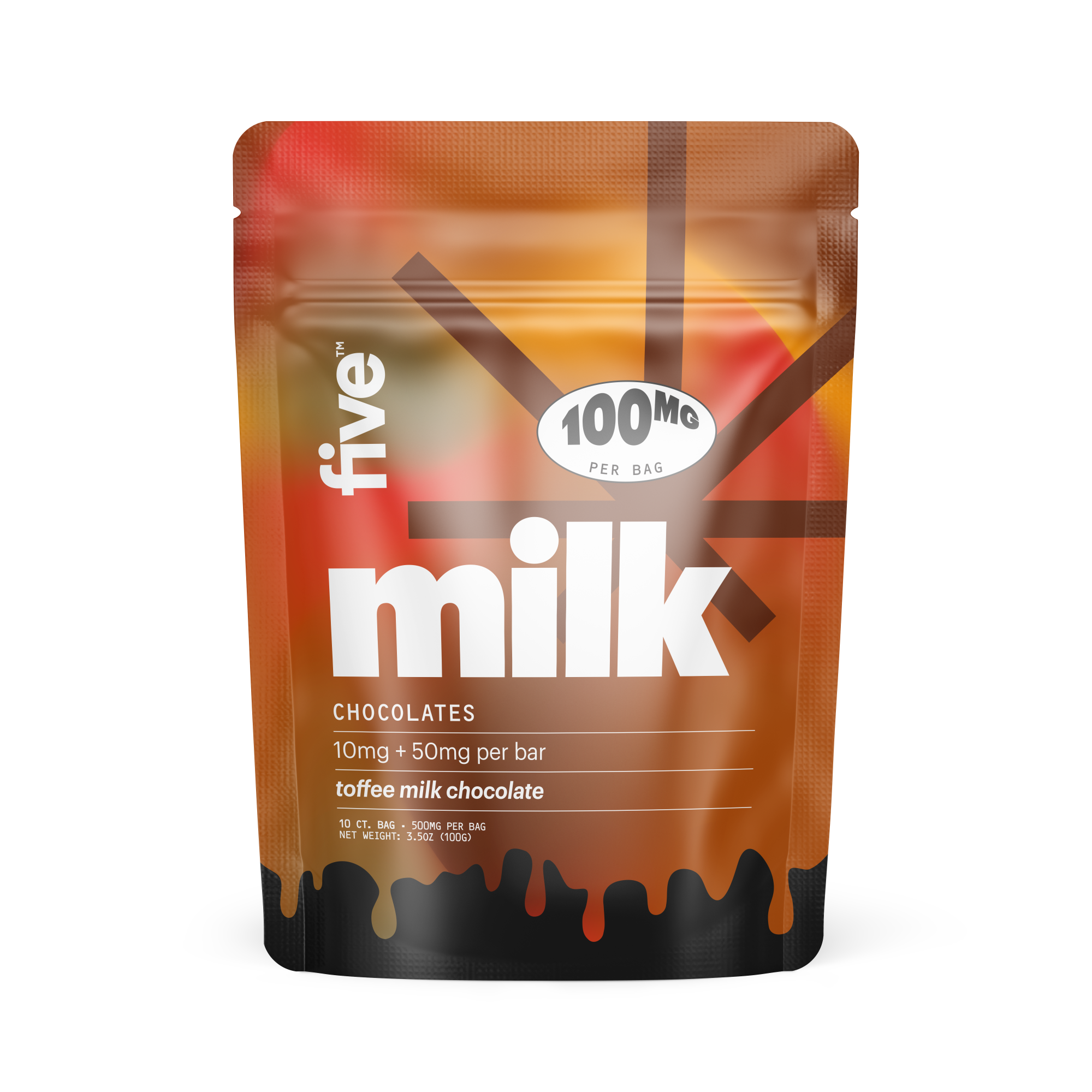 dive into high vibes with five's toffee milk chocolate squares, crafted for a deeply relaxing buzz. enjoy the sweet mix of creamy milk chocolate and crunchy toffee for a superior flavor journey.